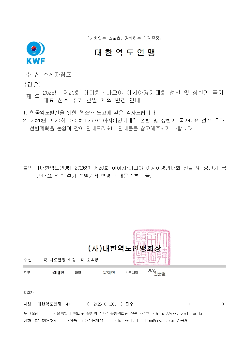 2026³â Á¦20ȸ ¾ÆÀÌÄ¡¡¤³ª°í¾ß ¾Æ½Ã¾Æ°æ±â´ëȸ ¼±¹ß ¹× »ó¹Ý±â ±¹°¡´ëÇ¥ ¼±¼ö Ãß°¡ ¼±¹ß °èȹ º¯°æ ¾È³» |